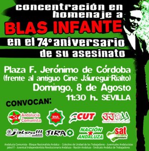 Con motivo del 74º aniversario del asesinato de Blas Infante, el próximo domingo 8 de agosto se celebrará un homenaje unitario por parte de las organizaciones de la  izquierda soberanista andaluza, entre ellas el Sindicato Andaluz de Trabajadores,  al Padre de la Patria Andaluza en Sevilla.