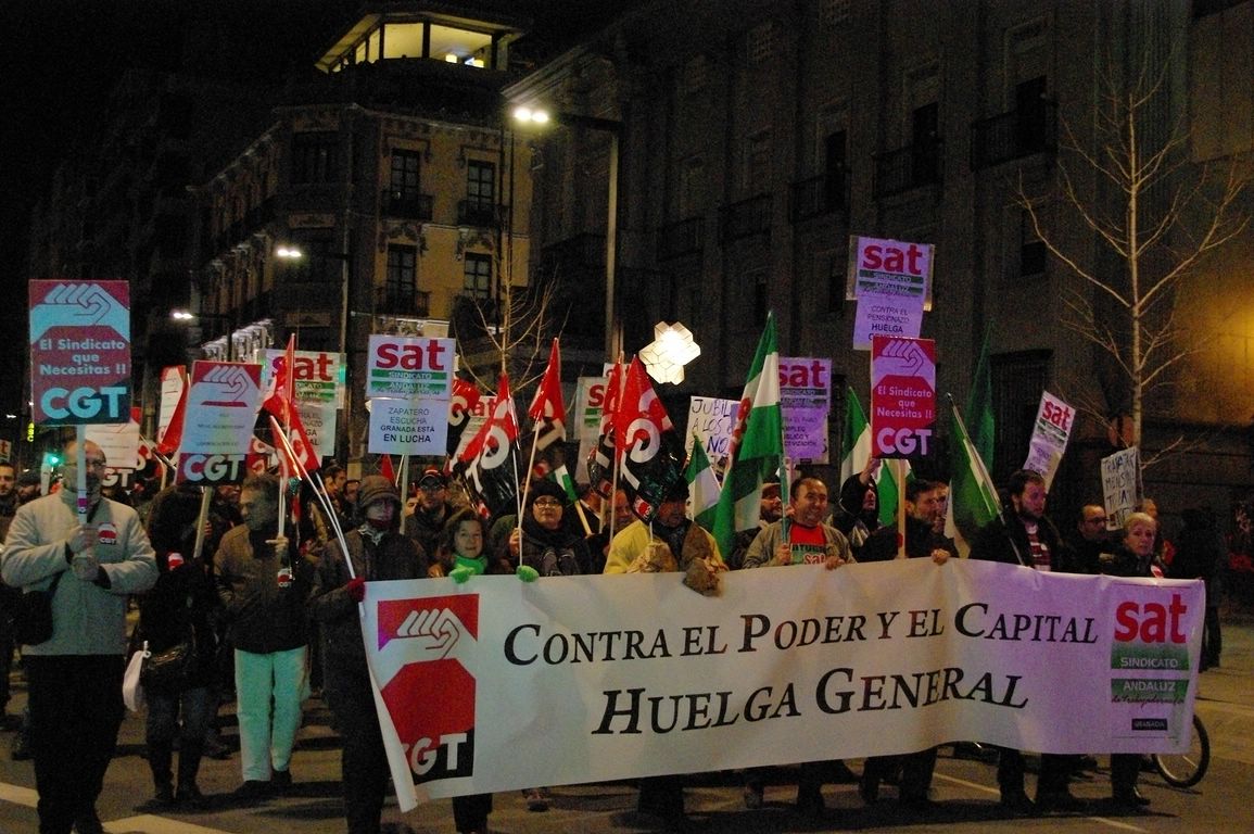 Durante todo el recorrido los asistentes gritaron consignas como «GRIÑAN Y ZAPATERO ¡EMBUSTEROS!», «AQUÍ ESTAMOS; NOSOTR@S NO PACTAMOS» o «ASÍ NI UN PASO ATRÁS, EN ANDALUCÍA HUELGA GENERAL». También hubo algunas paradas frente a la subdelegación de gobierno (recordando el papel de esta institución en las tareas represivas de los movimientos sociales en todas las comarcas granadinas y frente a FOREM, institución paralela a los sindicatos del sistema que absorbe buena parte de los presupuestos de formación para los trabajadores/as.