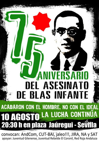 Un año más, las fuerzas socio-políticas de la Izquierda Soberanista Andaluza homenajearán a Blas Infante, en conmemoración del 75º aniversario de su asesinato por el fascismo español. Nuevamente lo haremos en la céntrica Plaza sevillana popularmente conocida por Plaza de Jáuregui, y oficialmente denominada como Plaza Padre Jerónimo de Córdoba, lugar donde estaba ubicado el antiguo Teatro Jáuregui, que durante los primeros meses del Golpe de Estado de la rección españolista fue habilitado como cárcel de presos políticos.