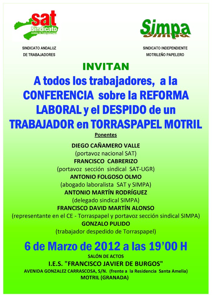 El pasado 27 de enero de 2012 fue despedido nuestro compañero Gonzalo Pulido, de Torraspapel Motril. Esta empresa, que presume de productividad, de beneficios empresariales y de una política de empleo a favor de la estabilidad laboral, muestra una vez más esa cara oculta que sólo conocen los que, día tras día, viven la realidad de la fábrica desde dentro (nada que ver con las bondades que se muestran hacia fuera).