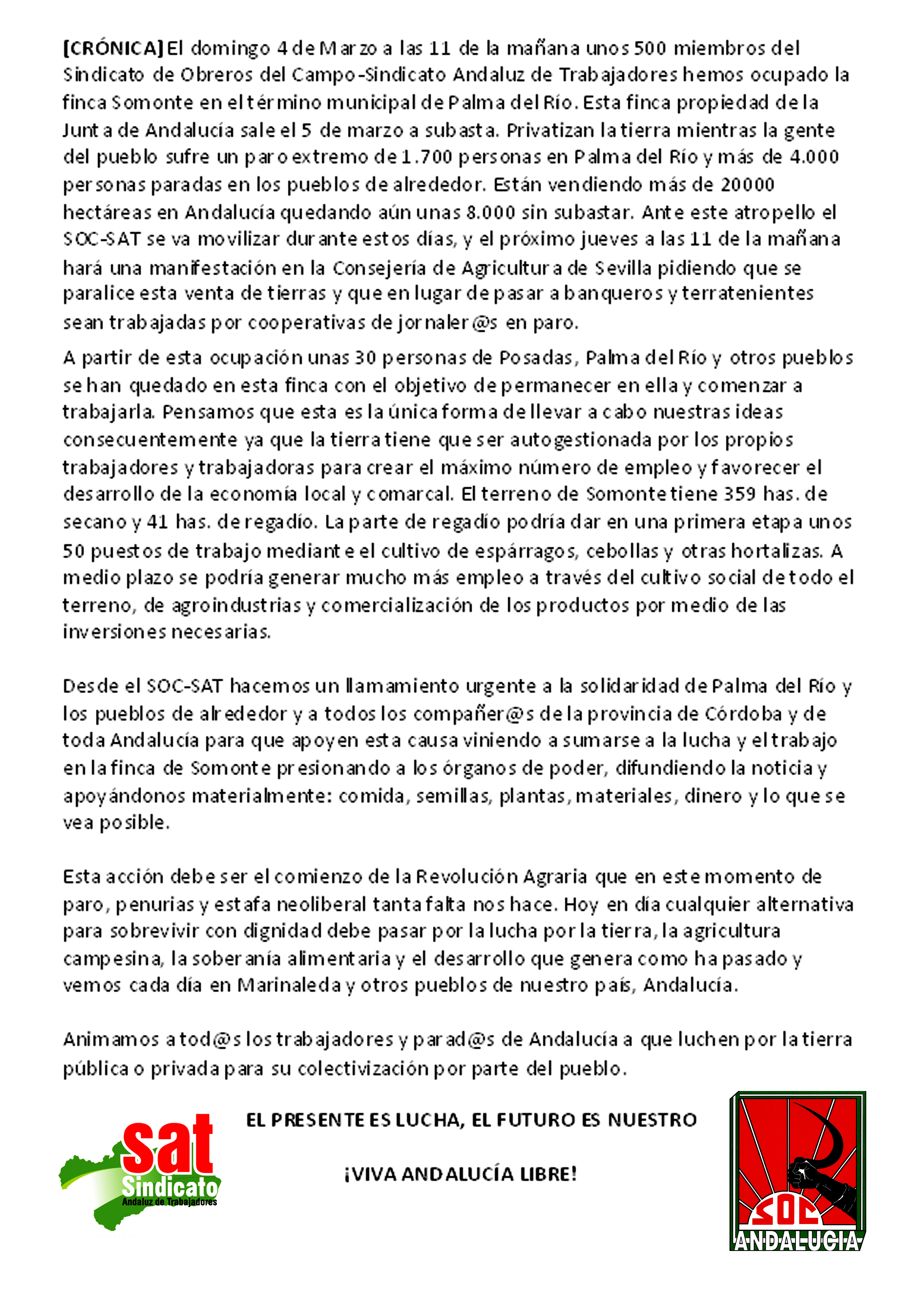 CRÓNICA DE LA OCUPACIÓN DE UNA FINCA EN PALMA DEL RÍO EL PASADO DOMINGO Comparte y difunde: Haz clic para compartir en Facebook (Se abre en una ventana nueva) Facebook Haz clic para compartir en X (Se abre en una ventana nueva) X Haz clic para compartir en Telegram (Se abre en una ventana nueva) Telegram Haz clic para compartir en WhatsApp (Se abre en una ventana nueva) WhatsApp Más Haz clic para compartir en Tumblr (Se abre en una ventana nueva) Tumblr Haz clic para imprimir (Se abre en una ventana nueva) Imprimir Haz clic para enviar un enlace por correo electrónico a un amigo (Se abre en una ventana nueva) Correo electrónico Me gusta Cargando...