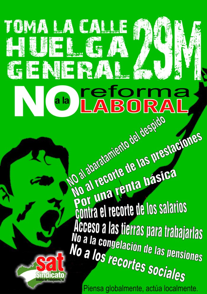 Los sindicatos Co.Bas, CGT y SAT nos hemos unido para movilizarnos conjuntamente en este día de Huelga General. No somos sindicatos ”mayoritarios” pues no contamos con los millones de euros que el estado les aporta para sujetar el sistema. Somos organizaciones obreras que defendemos los derechos de l@s trabajadores/asgranadin@s, y ahora luchamos contra esta nueva Reforma Laboral que nos amputa derechos que consiguieron las generaciones anteriores derramando mucha sangre, cárcel, sudor y lágrimas.
