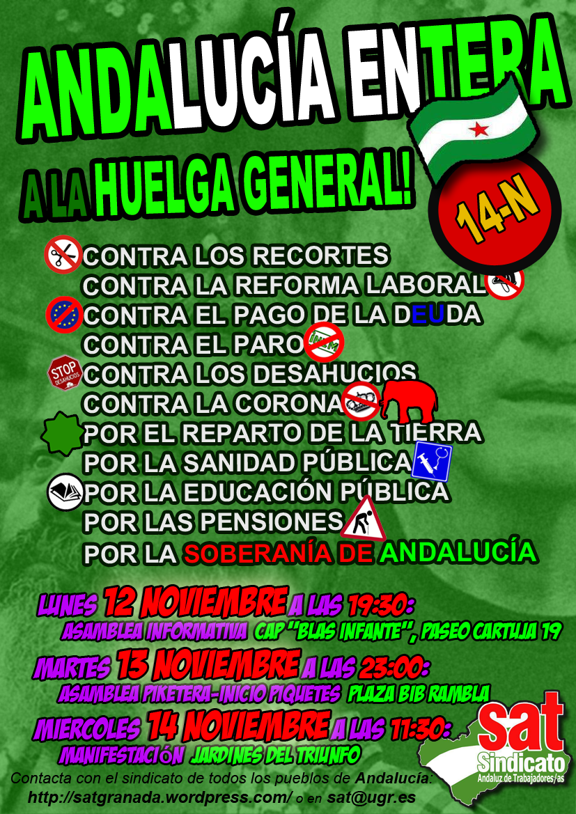 Desde el Sindicato Andaluz de Trabajadores y Trabajadoras (SAT) llamamos a la movilización, a la organización y a construir poder popular. Ahora más que nunca es necesario un sindicato de base combativo que luche junto a los trabajadores y trabajadoras por un cambio de sistema. Rechazamos el Real Decreto-Ley 14/2012, los planes de recortes de la Junta de Andalucía y la involución educativa que plantea el Partido Popular. A su vez proponemos algunas medidas urgentes: