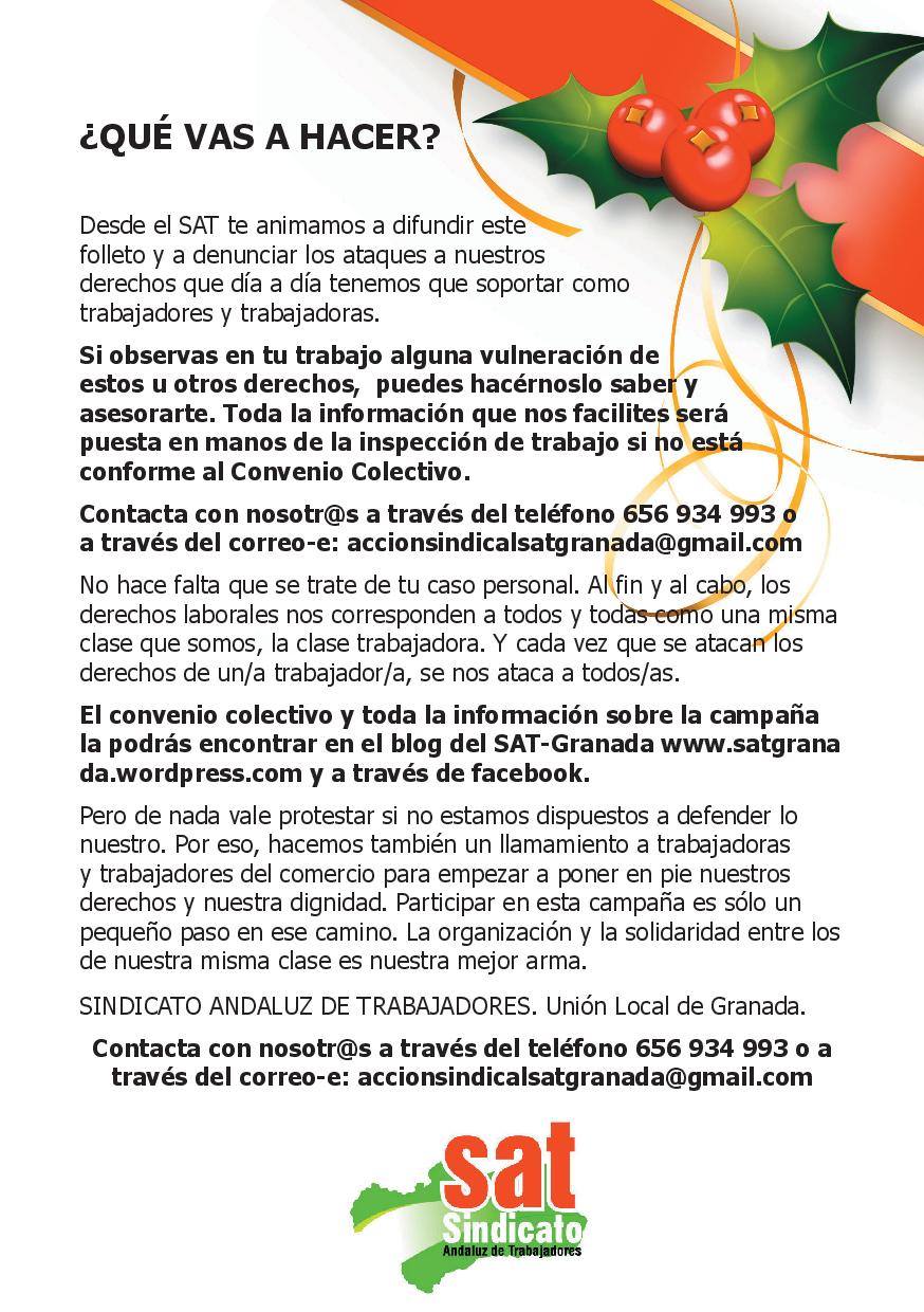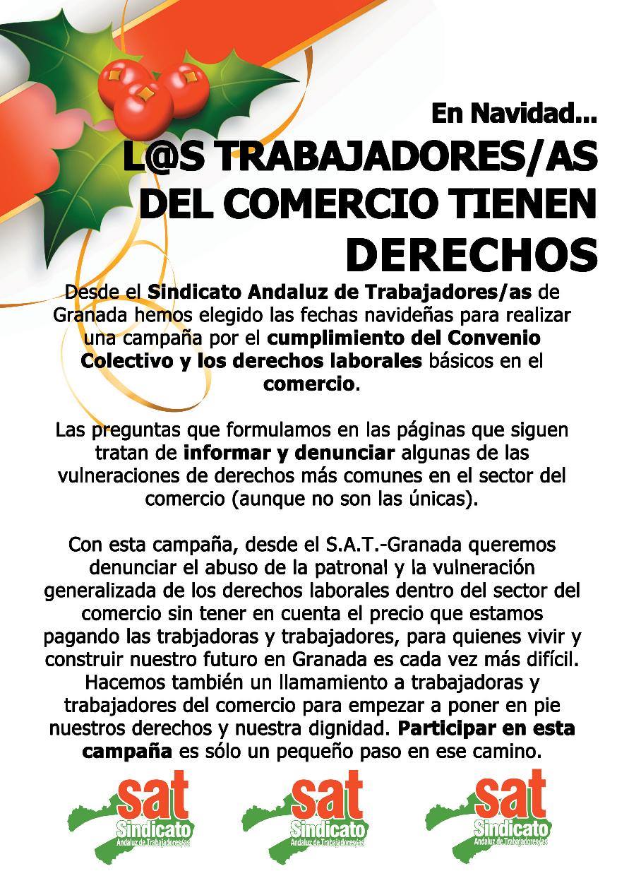 Desde el SAT Granada hemos puesto en marcha una campaña navideña por el cumplimiento del convenio colectivo y los derechos laborales básicos en el sector del comercio. Hemos elegido estas fechas porque, aunque la explotación suele darse durante todo el año, es en fiestas navideñas cuando las trabajadoras y trabajadores de este sector son más vulnerables a los abusos patronales.