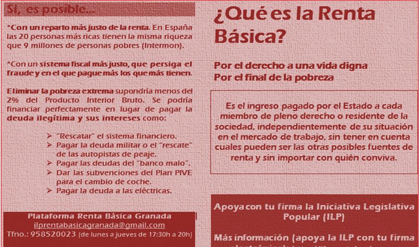 Por esta razón el Movimiento contra el Paro y la Precariedad ha tomado la iniciativa de presentar una Iniciativa Legislativa Popular para la implantación en el Estado español de una RENTA BASICA UNIVERSAL, INCONDICIONAL, INDIVIDUAL Y SUFICIENTE, que permita a tod@ cubrir dignamente las necesidades mínimas. Exige su implantación en dos fases. La primera, de inmediata aplicación, afectaría a todos los que no cobren nada o cobren alguna prestación por debajo de su importe (645,33 euros mensuales), y en la segunda fase, su implantación como Derecho universal.