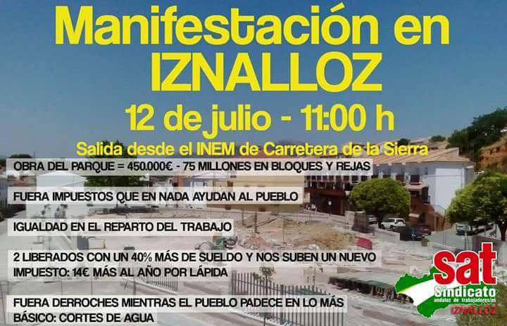 Para el portavoz de la Unión Local del SAT de Iznalloz: » el cese de obras faraónicas como son las obras en el parque (que han consumido más de 450.000€ en gastos y materiales) es absolutamente necesario para que los dineros que se despilfarran se empelen en reparto igualitario y justo del trabajo que generan las obras municipales». No escapan a las críticas del Sindicato Andaluz las reiteradas subidas de impuestos y tasas y el aumento de gastos en los pagos a «personal de confianza» del equipo de gobierno de Iznalloz.