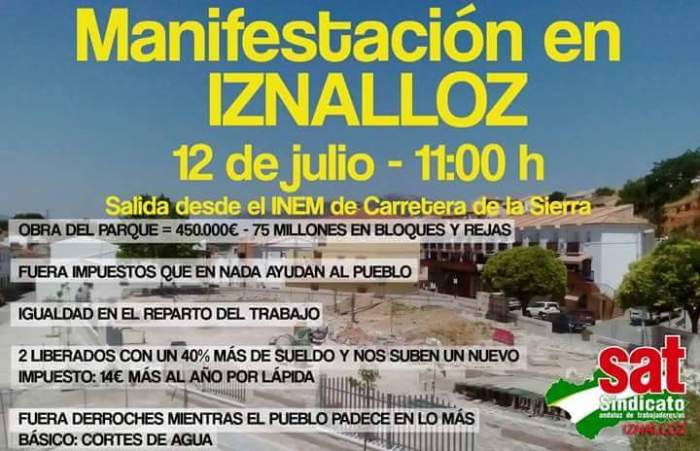 El Sindicato Andaluz de Trabajadores y Trabajadoras (SAT) ha convocado para mañana martes 12 de julio a las 11 horas una manifestación en Iznalloz que partirá desde la oficina del INEM de la Carretera de la Sierra de la localidad de los Montes Orientales.