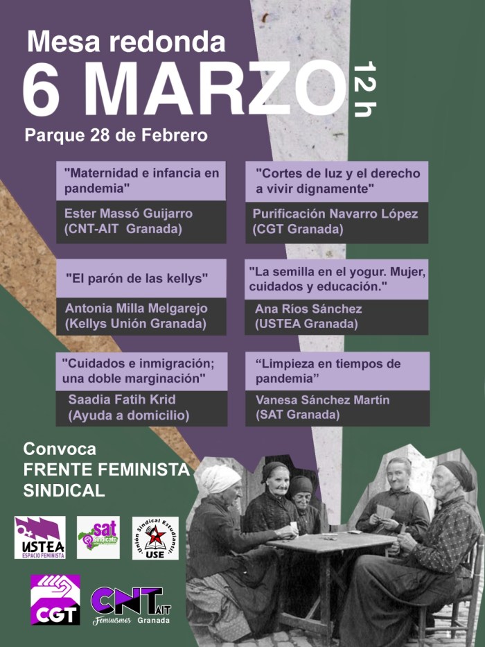 Esta mañana a las 12h, el Frente Feminista Sindical del que forma parte el SAT junto con USTEA, CGT, CNT y USE ha celebrado una mesa redonda de mujeres trabajadoras en el parque 28 de febrero, en la zona norte de Granada.