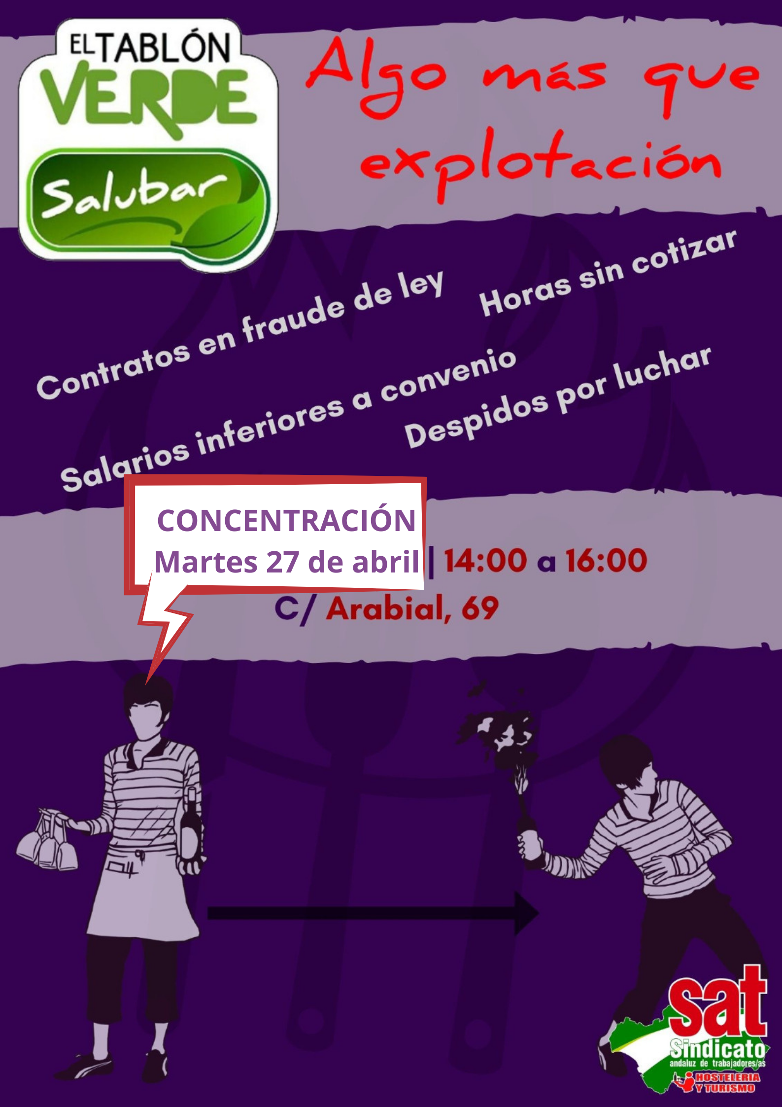 Este martes 27 de abril , entre las 14:00 y las 16:00, volvemos a concentrarnos delante del local de El Tablón Verde en la calle ARABIAL 69, para seguir denunciando la situación de explotación que sufre la plantilla desde hace largo tiempo y luchar por la readmisión de nuestras compañeras y delegadas sindicales Lidia y Victoria, así como para exigir el pago de lo que se debe a las trabajadores y trabajadoras.