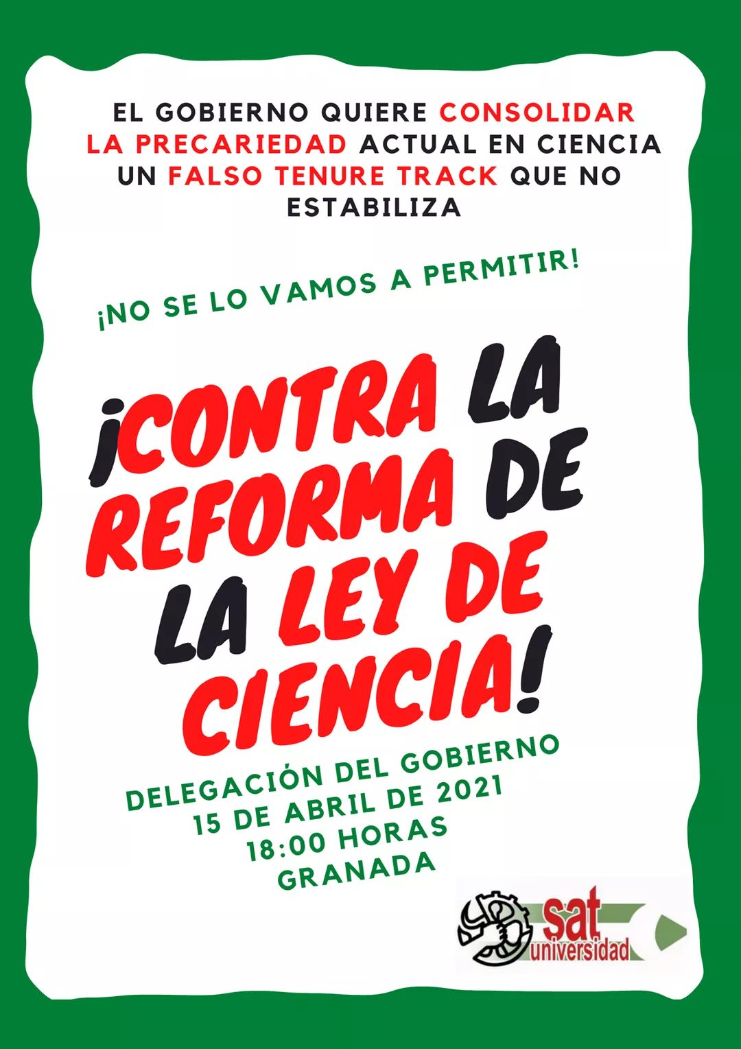 Desde SAT Universidad de Granada apoyamos la convocatoria de concentración propuesta por Marea Roja el próximo jueves 15 de abril en varias ciudades del estado contra la reforma de la ley de ciencia propuesta por el gobierno. Nos vemos a las 18:00 en la Subdelegación del Gobierno (C/ Gran Vía), Granada.