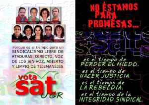 Se acercan las elecciones sindicales en la Universidad de Granada.  La sección sindical del SAT está enfrascada en la campaña electoral.  Reproducimos el programa sindical del SAT en la UGR (en formato jpeg y en pdf para facilitar su descarga).