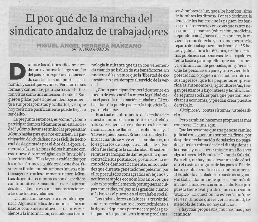 Favorecer y apuntarse a determinadas reivindicaciones “porque sí”, para no quedar fuera de la foto y sin reflexionar por qué se producen y a qué intereses favorecen esas movilizaciones no es muy edificante ni tan siquiera serio. Es por ello que, desde el Sindicato Andaluz de Trabajadores y Trabajadoras (SAT), sindicato de izquierdas, andaluz, solidario y a pie de tajo analizamos cada una de ellas y, en función de este análisis y de la decisión adoptada por nuestras asambleas, actuamos en consecuencia. Desde el SAT entendemos que nuestra primera obligación como sindicalistas -empeñados en cambiar esta sociedad en que vivimos para conseguir las aspiraciones de justicia, trabajo y dignidad que demanda el pueblo andaluz- es la de conocer la realidad. Esta realidad nos muestra cómo muchos de aquellos que pusieron el grito en el cielo cuando, con la llegada de la Democracia, se crearon las diversas Universidades Andaluzas con la excusa de que se robaba a Granada su hegemonía universitaria en la Alta Andalucía (la Andalucía Oriental dirían ellos) ahora claman por un TSJA con todas las salas aquí, o defienden el mantenimiento de dos hospitales, los mismos que ellos privatizarían sin pestañear.